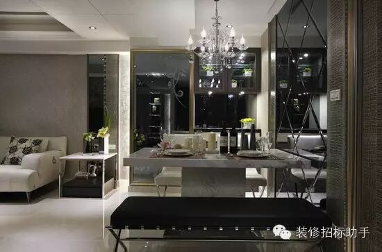 装修招标小妹点评:菱形镜面的质感拼接,延伸上卡典西德妆点的反射立面,开展双向性的宽阔视角。