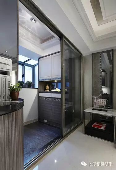 装修招标小妹点评:因对应的主卧尺度不足,境庭设计于廊道转折处加以展示柜体,面宽加长之际也提高了空间的完整度。