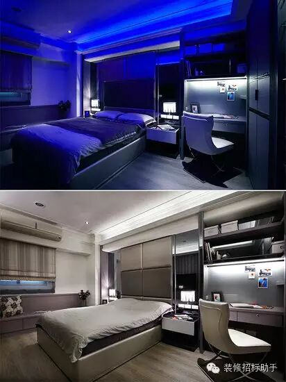 装修招标小妹点评:想要拥有夜店表情的弟弟房,灯光上透过多彩LED妆点切换氛围。