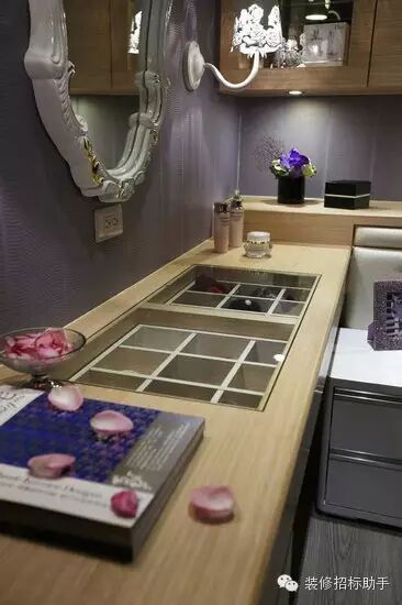 装修招标小妹点评:欲让石材纹理尽情挥洒,设计师将设备柜以雕刻板门片收于侧向,利落表现台面净度。